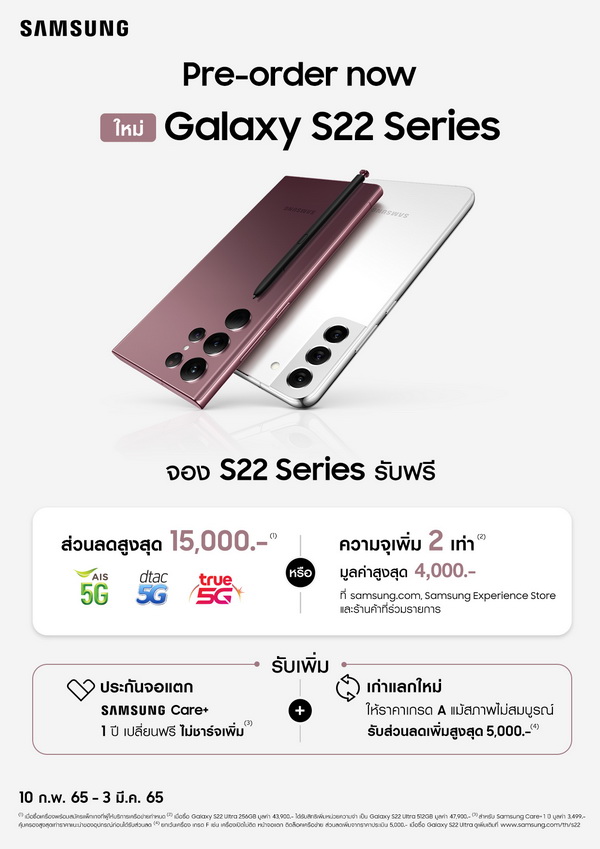 พิเศษสำหรับช่วงพรีออเดอร์ระหว่างวันนี้ – 3 มีนาคม 2565 กับส่วนลดสูงสุดถึง 15,000 บาทเมื่อจองผ่าน AIS DTAC และ TRUE หรือ รับฟรีความจุเพิ่ม 2 เท่า มูลค่าสูงสุด 4,000 บาท พร้อมประกันจอแตก 1 ปี ไม่มีชาร์จเพิ่มมูลค่า 3,499 บาท ยิ่งกว่านั้น กับแคมเปญเก่าแลกใหม่ ให้ราคาเกรด A และรับส่วนลดเพิ่มจากราคาประเมิน 5,000 บาท แม้สภาพไม่สมบูรณ์อีกด้วย เมื่อจองผ่าน samsung.com, Samsung Experience Store และร้านค้าที่ร่วมรายการ พิเศษรับเพิ่ม! เครดิตเงินคืนสูงสุด 20% ผ่านบัตรเครดิต SCB และ e-voucher มูลค่า 1,000 บาท เฉพาะที่ samsung.com, Samsung Experience Store เท่านั้น