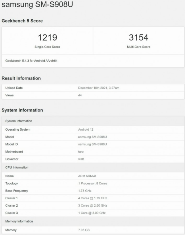 เมื่อไม่นานมานี้ สมาร์ทโฟนเลขรหัสโมเดล SM-S908N และ SM-S908U จาก Samsung ได้ไปปรากฏตัวบนแหล่งทดสอบประสิทธิภาพสมาร์ทโฟนชื่อดังอย่าง Geekbench พร้อมเปิดเผยให้เห็นถึงสเปกเด่นบางส่วน โดยสมาร์ทโฟนรุ่นดังกล่าวมาพร้อมกับหน่วยความจำ RAM ขนาด 8GB / 10GB พร้อมรันด้วยชิปเซ็ตประมวลผล Snapdraogn 8 Gen 1 ซึ่งทำคะแนนทดสอบแบบ Single-Core ไปได้ทั้งหมด 1,219 คะแนน และทำคะแนนทดสอบแบบ Multi-Core ได้ทั้งหมด 3,154 คะแนน โดยจะรันด้วยระบบปฏิบัติการ Android 12 ตั้งแต่แกะกล่อง