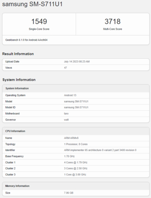เมื่อไม่กี่วันที่ผ่านมา Samsung Galaxy S23 FE ได้ไปโผล่ในแพลตฟอร์ม Geekbench ด้วยรหัส SM-S711U1 โดย Samsung Galaxy S23 FE ผ่านการทดสอบด้วยระบบปฏิบัติการ Android 13, RAM 8GB และ เมนบอร์ด “taro” ซึ่งเป็นรหัสสำหรับ Snapdragon 8 Gen 1