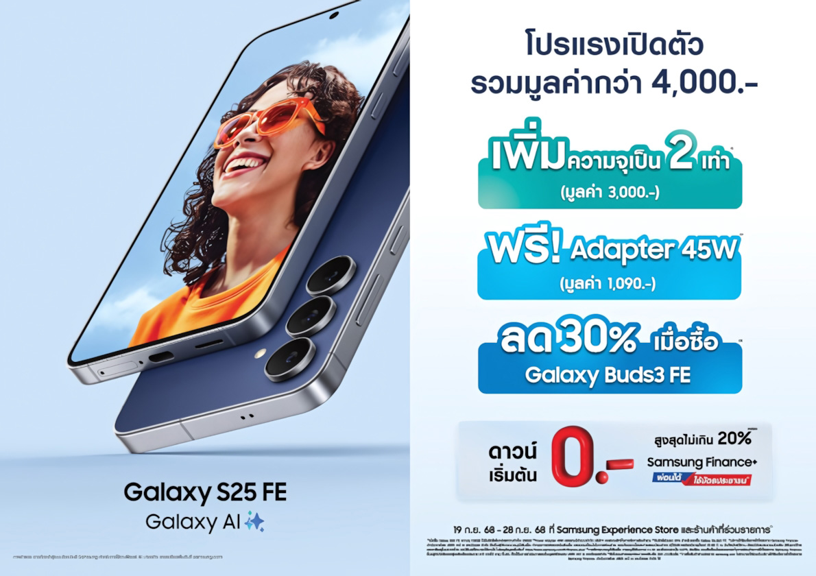 ซัมซุงใจดี ต่อโปรฯ ต้อนรับการเปิดตัว S Series ตัวซีเคร็ต อย่าง Samsung Galaxy S25 FE สมาชิกใหม่ล่าสุดจาก Galaxy S25 Series มาในราคาที่สองหมื่นต้น เสิร์ฟโปรฯ จัดเต็มแบบจุก ๆ คุ้ม 3 ต่อ ขยายเวลาถึง 28 ก.ย. 68 นี้เท่านั้น! คุ้มอีกต่อ เริ่มดาวน์ 0 บาท ใช้บัตรประชาชนใบเดียว กับ Samsung Financial+