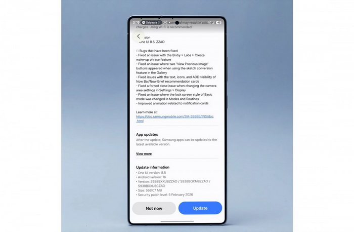 อัปเดตสำหรับเครื่องที่อยู่ในโปรแกรมเบต้ามาในรูปแบบดาวน์โหลดขนาด 568MB และมาพร้อมระดับแพตช์ความปลอดภัยวันที่ 5 กุมภาพันธ์ 2026 โดยเมื่อตระกูล Galaxy S26 ใกล้วางขายแล้ว ก็อาจได้เห็นการปล่อยอัปเดต One UI 8.5 แบบเร็ว ๆ สำหรับอุปกรณ์ตระกูล Galaxy S25 ซึ่งมีความเป็นไปได้ว่าเบต้าครั้งนี้อาจเป็นรอบสุดท้ายก็ได้