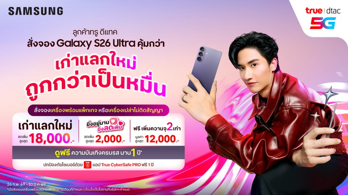 ทรู ดีแทค 5G ชวนคนไทย สั่งจองเอไอโฟนเรือธงรุ่นใหม่ Samsung Galaxy S26 Ultra ที่มาพร้อมกับ World’s First Privacy Display มือถือจอกันเผือกครั้งแรกของโลก รวมทั้งฟีเจอร์ AI และกล้องชัดทรงพลัง จัดเต็มตามแบบฉบับ Samsung พร้อมตอกย้ำความล้ำของ เอไอโฟนรุ่นใหม่ไปกับ เต-ตะวัน วิหครัตน์ Co Presenter ตัวแทนคนรุ่นใหม่ ที่จะมาร่วมถ่ายทอดประสบการณ์ความคุ้ม บนเครือข่ายที่เร็ว แรง และปลอดภัยที่สุด ก่อนเค้า… ก่อนใคร