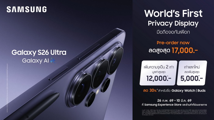 จับจองเป็นเจ้าของ Galaxy S26 Ultra, Galaxy S26+ และ Galaxy S26 ก้าวสู่ยุคใหม่ของมือถือ AI ได้แล้ววันนี้ พร้อมเปิดให้ Pre-order ตั้งแต่วันที่ 26 กุมภาพันธ์ 2569 จนถึง 10 มีนาคม 2569 ได้ที่ Samsung Experience Store และร้านค้าที่ร่วมรายการ หรือทางออนไลน์ https://smsngshop.com/s26-pr_buy พร้อมรับสิทธิพิเศษในช่วง Pre-order รับส่วนลดสูงสุด 17,000 บาท*