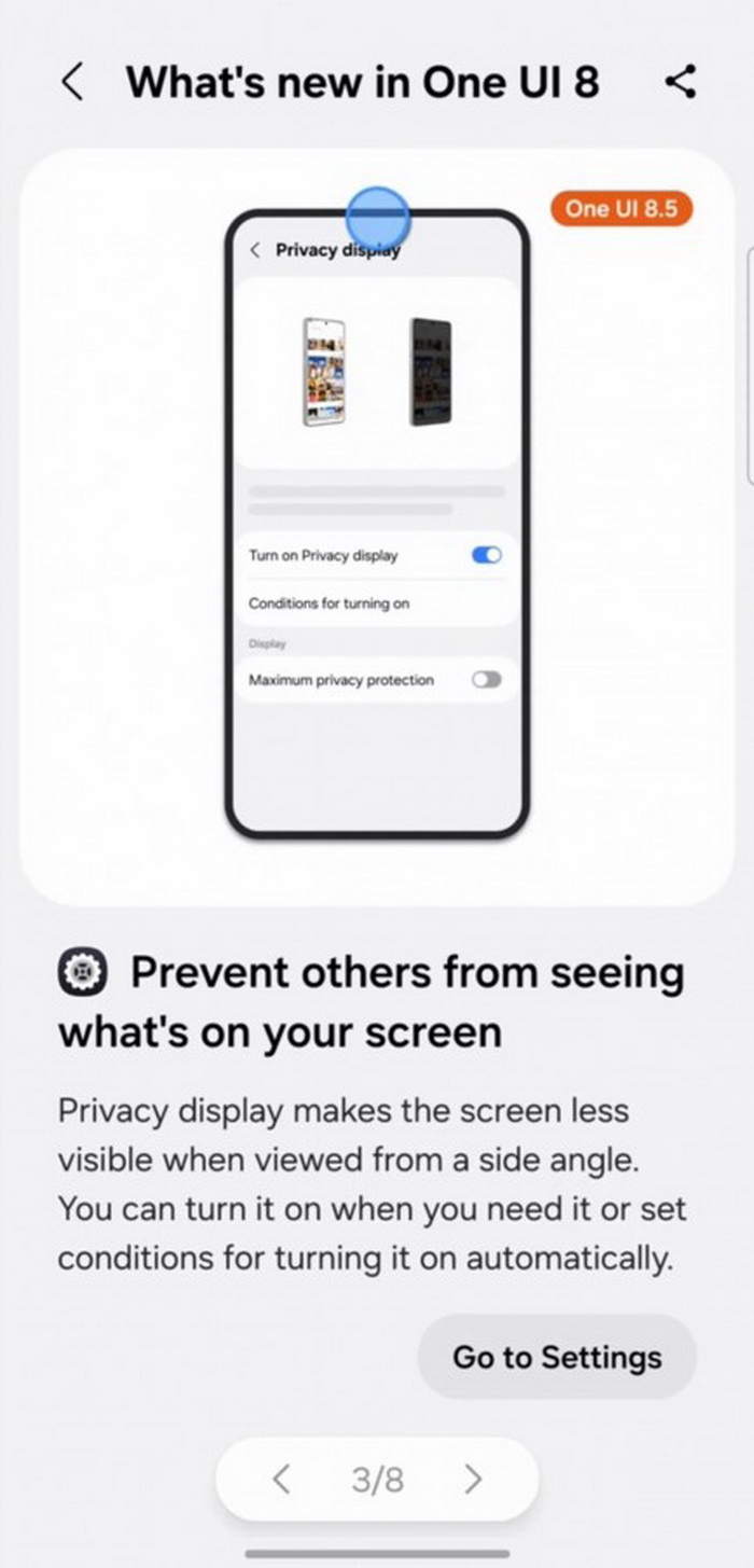 จากภาพหน้าจอของ One UI 8.5 ระบุว่า Privacy Display จะมีระดับความเข้ม 2 แบบ ได้แก่ระดับเริ่มต้น (ค่าเริ่มต้น) และโหมด “Maximum privacy protection” ซึ่งคาดว่าจะเพิ่มความเป็นส่วนตัวให้สูงขึ้น โดยทำให้มุมมองที่หน้าจอ “ยังมองเห็นได้จริง” แคบลงกว่าเดิม