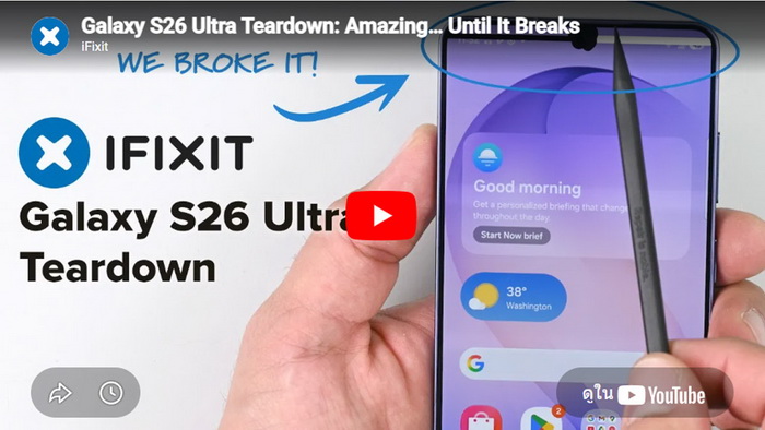 ไม่กี่วันก่อนเราได้เห็นวิดีโอแกะเครื่องหรือถอดประกอบของ Samsung Galaxy S26 รุ่นมาตรฐานกันไปแล้ว และล่าสุดทาง iFixit ก็ได้เผยแพร่วิดีโอแกะเครื่องของ Galaxy S26 Ultra ออกมาเพิ่มเติม