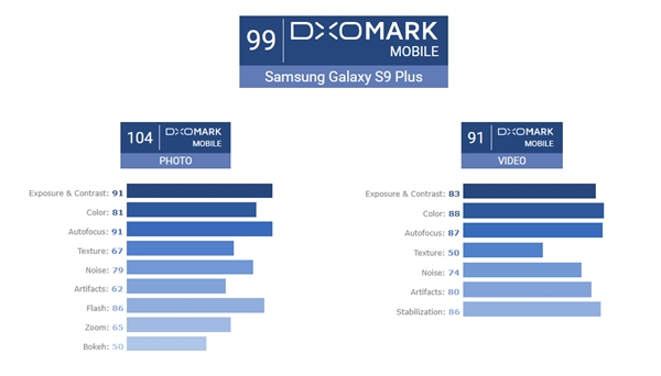 โดยทาง DxOMark ให้คะแนนการถ่ายภาพนิ่งของ Samsung Galaxy S9+ อยู่ที่ 104 คะแนน โดยมีจุดเด่นในเรื่องของ exposure และ contrast รวมไปถึงระบบ autofocus ที่รวดเร็วเท่าที่ทาง DxOMark เคยทำการทดสอบมา นอกจากนี้ ยังมีจุดเด่นในเรื่องของการซูมภาพ และการเก็บรายละเอียด แต่มีบางจุดที่ยังต้องปรับปรุงอย่าง เช่น การยิงไฟแฟลช รวมไปถึงการถ่ายภาพหน้าชัดหลังเบลอ หรือ Bokeh Effect ที่ยังมีข้อผิดพลาดในด้านการเบลอตัวแบบกับฉากหลังปรากฏให้เห็นอยู่ ส่วนทางด้านการถ่ายวิดีโอกวาดคะแนนไปทั้งหมด 91 คะแนน มีจุดเด่นในเรื่องของสีสันที่จัดจ้าน, ระบบป้องกันภาพสั่นไหว และการจัดการ Noise ที่ค่อนข้างดี โดยคุณสมบัติกล้องของ Samsung Galaxy S9+ มีดังนี้