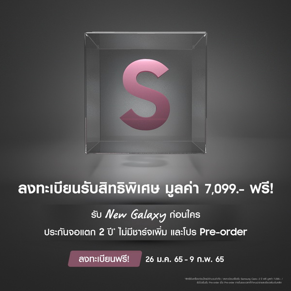 สำหรับกาแลคซี่แฟนชาวไทย สามารถร่วมเป็นส่วนหนึ่งของการเปิดตัวครั้งยิ่งใหญ่ ด้วยการลงทะเบียนเพื่อติดตามข้อมูลและรับสิทธิพิเศษมูลค่าสูงถึง 7,099 บาท ได้แล้วตั้งแต่วันนี้ – 9 กุมภาพันธ์ 2565 โดยสิทธิพิเศษดังกล่าวครอบคลุมถึงประกันอุบัติเหตุ Samsung Care+ ซึ่งรับประกันจอแตกนาน 2 ปี* ไม่มีชาร์จเพิ่ม พร้อมโปรโมชั่น พรีออเดอร์ที่ทุกคนต่างตั้งตารอคอยอีกด้วย
