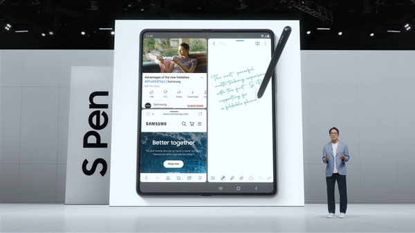 - ต่อด้วยเสียงเพลง Over the Horizon ที่โปรดิวซ์โดย SUGA จากวง BTS เพื่อนำสู่การเปิดตัวไฮไลท์สำคัญที่ทุกคนรอคอยอย่างสมาร์ทโฟนหน้าจอพับได้เจเนอเรชันที่สาม Galaxy Z Fold3 ที่ถือเป็นครั้งแรกของสมาร์ทโฟนตระกูล Z Series กับมาตรฐานการทนน้ำระดับ IPX8 และวัสดุตัวเครื่องจาก Armor Aluminum รวมถึง Corning® Gorilla® Glass Victus™ พร้อมฟิล์มกันรอยแบบยืดชนิดใหม่ (Stretchable PET) ทำให้หน้าจอมีความแข็งแรงขึ้นกว่าเดิมถึง80% อีกทั้งยังเป็นครั้งแรกกับการใช้งานร่วมกัน S Pen เวอร์ชั่นใหม่ อย่าง S Pen Fold Edition และ S Pen Pro ที่ออกแบบมาเพื่อใช้งานร่วมกับสมาร์ทโฟนหน้าจอพับได้โดยเฉพาะ พร้อมการร่วมเป็นพันธมิตร่วมกับแอปพลิเคชันยอดนิยม อย่าง Spotify, YouTube และTikTok เพื่อมอบประสบการณ์การใช้สมาร์ทโฟนหน้าจอพับได้ที่ดีที่สุดอีกด้วย