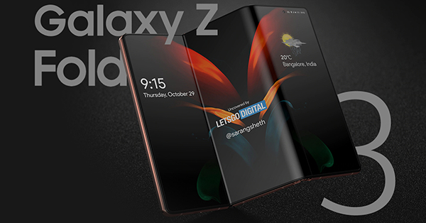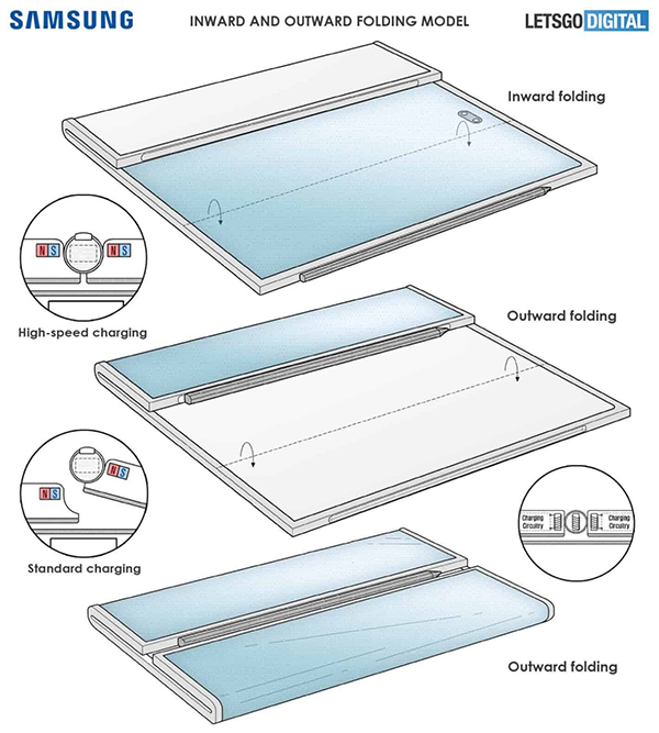 สิทธิบัตรดังกล่าวถูกพบและเผยแพร่โดยเว็บไซต์ LetsGoDigital ซึ่งเป็นดีไซน์สมาร์ทโฟนพับได้แบบ 3 ทบ ตัวบานพับสามารถพับได้ทั้งเข้าและออก ทำให้มีความยืดหยุ่นในการใช้งานมากขึ้น เมื่ออยู่ในโหมดพับ ผู้ใช้จะสามารถเลือกได้ว่าจะให้หน้าจอหันออกด้านนอก หรือเก็บเข้าด้านในก็ได้ และเมื่อกางออกจนสุด ตัวเครื่องจะมีหน้าจอทรงสี่เหลี่ยมผืนผ้าที่มีสัดส่วนยาวกว่า Galaxy Z Fold และ Z Fold 2 ทำให้เหมาะกับคอนเทนต์แบบ Wide Screen มากยิ่งขึ้น