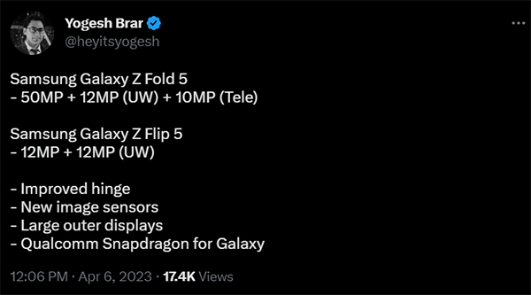 Yogesh Bhar แหล่งข่าวหลุดที่เชื่อถือได้จากประเทศอินเดีย เปิดเผยว่า Samsung Galaxy Z Fold5 จะใช้กล้องหลังความละเอียด 50MP เท่าเดิม ตามมาด้วยกล้อง Ultrawide 12MP และ Telephoto 10MP ส่วน Galaxy Z Flip5 จะยังคงเป็นกล้องคู่ความละเอียด 12MP กับกล้อง Ultrawide เหมือนเดิม อย่างไรก็ดี ทั้งสองรุ่นจะใช้เซนเซอร์รับภาพตัวใหม่ซึ่งอาจทำให้คุณภาพของรูปถ่ายและวิดีโอดีขึ้นในภาพรวม