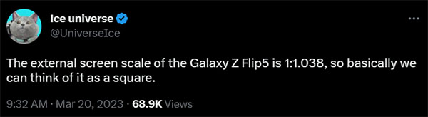 อีกด้านหนึ่ง Galaxy Z Flip5 จะขยายหน้าจอบนฝาพับให้กว้างขึ้นเป็น 3.4 นิ้ว ในอัตราส่วน 1:1.038 เรียกได้ว่าแทบจะเป็นสี่เหลี่ยมจตุรัส ครอบคลุมพื้นที่ส่วนใหญ่ของฝาพับ นอกจากนี้ขอบจอด้านในจะบางลงอีกด้วย