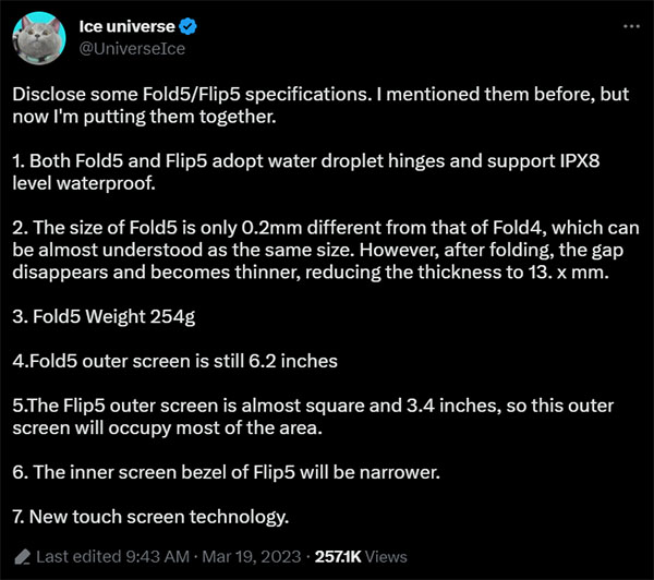 Ice Universe เปิดเผยว่า ทั้ง Galaxy Z Fold5 และ Galaxy Z Flip5 จะใช้ชิปเซ็ต Snapdragon 8 Gen 2 for Galaxy รุ่นเดียวกับที่ใช้ใน Galaxy S23 series และเป็นรุ่นปรับแต่งพิเศษเฉพาะสมาร์ทโฟนซัมซุงเท่านั้น และเปลี่ยนไปใช้บานพับแบบหยดน้ำซึ่งสามารถพับแนบกันได้สนิทไม่มีช่องว่างเหมือนที่ผ่านมา พร้อมตัวเครื่องกันน้ำกันฝุ่น IPX8 และใช้ ”เทคโนโลยีทัชสกรีนแบบใหม่” แต่ไม่ได้เปิดเผยรายละเอียด