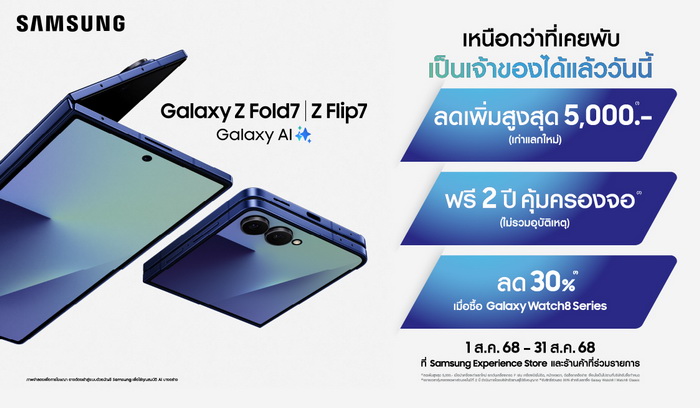 พร้อมแล้ววันนี้! ซัมซุงประกาศวางจำหน่าย Galaxy Z Fold7 และ Galaxy Z Flip7 ทั่วประเทศ ฉลองการเปิดตัว อัดโปรฯ เอาใจคนไทย เป็นเจ้าของพับเครื่องใหม่ในราคาสุดคุ้ม ใช้พับใหม่อุ่นใจ ด้วยโปรฯ ฟรีคุ้มครองจอ 2 ปี คุ้มต่อ! สำหรับแฟน ๆ ซัมซุง ซื้อได้ในราคาคุ้มกว่าเดิม เพียงใช้เครื่องเก่ามาแลกเครื่องใหม่ รับเลย! ส่วนลด 5,000 บาท และใครที่กำลังเล็งว่าจะซื้อ Galaxy Watch8 Series โอกาสนี้มาถึงแล้ว เพราะจะได้รับส่วนลด 30% ทันที โปรฯ ดี ๆ แบบนี้มีจำกัด เฉพาะการสั่งซื้อในวันที่ 1 ส.ค.68 – 31 ส.ค.68 ที่ Samsung Experience Store ร้านค้าที่ร่วมรายการ และสั่งซื้อ Galaxy Z Fold7 ทางออนไลน์ที่ https://www.samsung.com/th/smartphones/galaxy-z-fold7/buy/ และ Galaxy Z Flip7 ที่ https://www.samsung.com/th/smartphones/galaxy-z-flip7/buy/