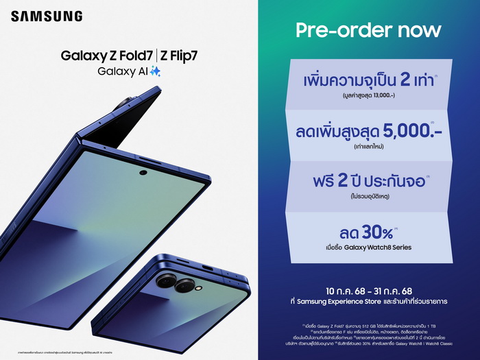 ซัมซุงเปิดสั่งจองล่วงหน้า Galaxy Z Fold7 และ Galaxy Z Flip7 กับโปรสุดคุ้ม ฟรี! คุ้มครองจอ 2 ปี วันนี้ - 31 ก.ค. นี้เท่านั้น เป็นเจ้าของ "พับที่เหนือกว่า" ก่อนใคร