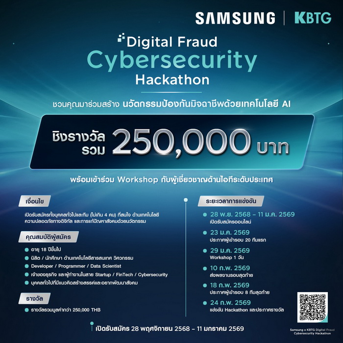 ซัมซุง ร่วมกับ KBTG เปิดรับสมัครโครงการ “Samsung × KBTG Digital Fraud Cybersecurity Hackathon” แล้วตั้งแต่วันที่ 28 พฤศจิกายน 2568 – 11 มกราคม 2569 เวทีเฟ้นหานักพัฒนา สตาร์ทอัป นักศึกษา และผู้เชี่ยวชาญด้านไซเบอร์ซีเคียวริตี้จากทั่วประเทศ เพื่อร่วมสร้างโซลูชัน AI ที่ช่วยรับมือภัยคุกคามออนไลน์และแก้ปัญหา Digital Fraud ซึ่งกำลังส่งผลกระทบต่อทั้งผู้บริโภคและธุรกิจในวงกว้าง