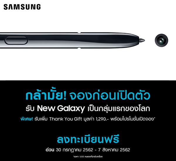 ท่านใดที่สนใจสามารถลงทะเบียนจอง New Galaxy ได้แล้ววันนี้ จนถึงวันที่ 7 สิงหาคม 2562 โดยจะได้รับตัวเครื่องก่อนใครภายในงาน New Samsung Galaxy ณ ลานเซ็นทรัลคอร์ท 6 ชั้น 6 ศูนย์การค้าเซ็นทรัลเวิลด์ ในวันที่ 16 สิงหาคม 2562 เวลา 10.00 น. - 20.00 น.