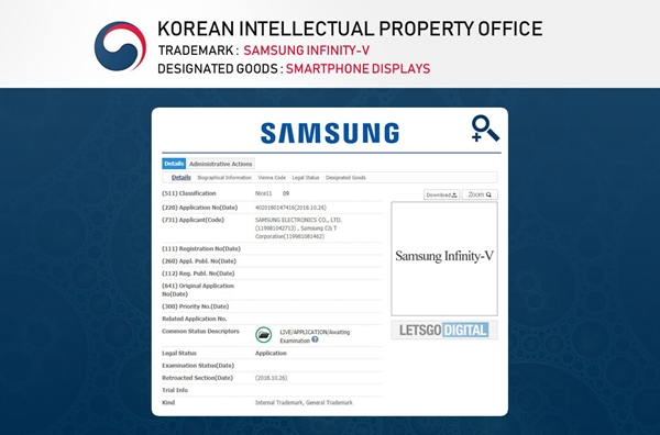 โดยเมื่อไม่นานมานี้ ทาง Samsng ได้จดเครื่องหมายการค้าในประเทศเกาหลีใต้ ภายใต้ชื่อ “Samsung Infinity-V” พร้อมกับระบุว่าเป็นชื่อของหน้าจอสำหรับใช้งานบนสมาร์ทโฟน ซึ่งถึงแม้ภายในเอกสารการขอยื่นจดเครื่องหมายการค้าฉบับนี้จะไม่ได้เปิดเผยให้ทราบว่า จอแบบ Infinity-V จะถูกนำไปใช้งานกับสมาร์ทโฟน Samsung รุ่นใด แต่ก่อนหน้านี้เคยมีรายงานจากสื่อต่างประเทศชั้นนำอย่าง Bloomberg ว่า ทาง Samsung กำลังพัฒนาสมาร์ทโฟนจอพับได้อยู่ในขณะนี้ภายใต้โค้ดเนม Winner ซึ่งเป็นโปรเจ็กต์ที่ถูกพัฒนามาเป็นเวลาหลายปีแล้ว และในตอนนี้ก็พัฒนารุ่นต้นแบบเสร็จสิ้นเป็นที่เรียบร้อยแล้วด้วย อีกทั้ง ยังมีการคาดการณ์กันว่า ตัวอักษร V ที่อยู่ในชื่อหน้าจอ Infinity แบบใหม่ มีความคล้ายคลึงกับลักษณะของมือถือที่กำลังพับจอเข้าหากัน ทำให้ความเป็นไปได้ที่ชื่อ Inifnity-V จะถูกนำมาใช้กับมือถือจอพับได้เริ่มเป็นมีมูลมากยิ่งขึ้น