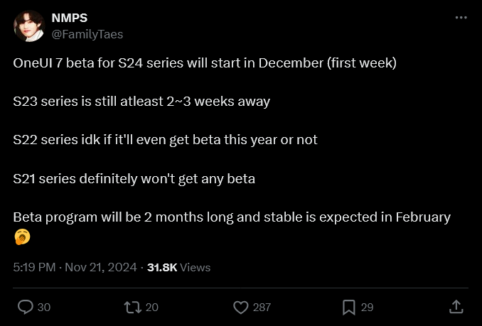 One UI 7 Beta Program จะใช้เวลาประมาณ 2 เดือน โดยคาดว่าเวอร์ชันเสถียรจะเปิดตัวในเดือนกุมภาพันธ์ปีหน้า หลังจากการเปิดตัว Galaxy S25 series สอดคล้องกับแถลงการณ์ของ Samsung ที่ระบุว่า One UI 7 จะใช้งานบน S25 series ได้เป็นรุ่นแรก ส่วนรุ่นอื่น ๆ จะไม่ได้อัปเดต One UI 7 ตัวเต็มก่อน S25 Series แน่นอนครับ