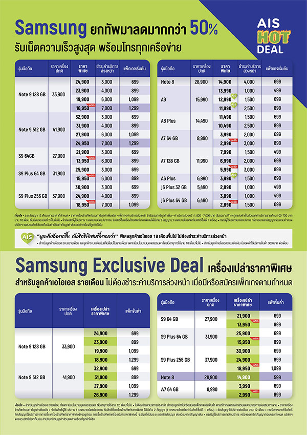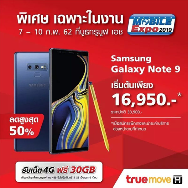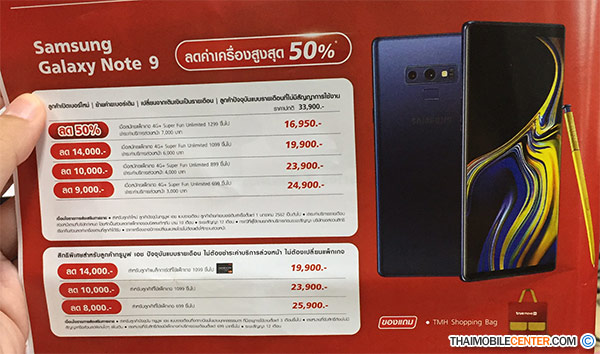 สำหรับ Samsung Galaxy Note 9 เรือธงรุ่นล่าสุด มาในราคาพิเศษด้วยเช่นกัน โดยรุ่น 128GB ลดเหลือเพียง 16,950 บาท (จากราคาปกติ 33,900 บาท) เมื่อสั่งซื้อพร้อมสมัครใช้งานแพ็กเกจรายเดือน Hot Deal 1,299 บาทขึ้นไป และชำระค่าบริการล่วงหน้า 7,000 บาท (ระยะสัญญา 12 เดือน)