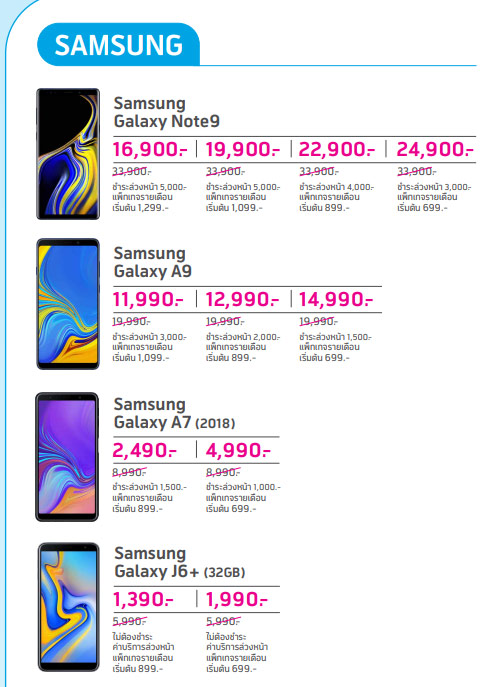 Samsung Galaxy A9 รุ่นล่าสุด มีราคา 11,990 บาท (จากราคาปกติ 15,990 บาท) เมื่อสั่งซื้อพร้อมสมัครใช้งานแพ็กเกจรายเดือน Hot Deal 899 บาทขึ้นไป และชำระค่าบริการล่วงหน้า 2,500 บาท (ระยะสัญญา 12 เดือน)