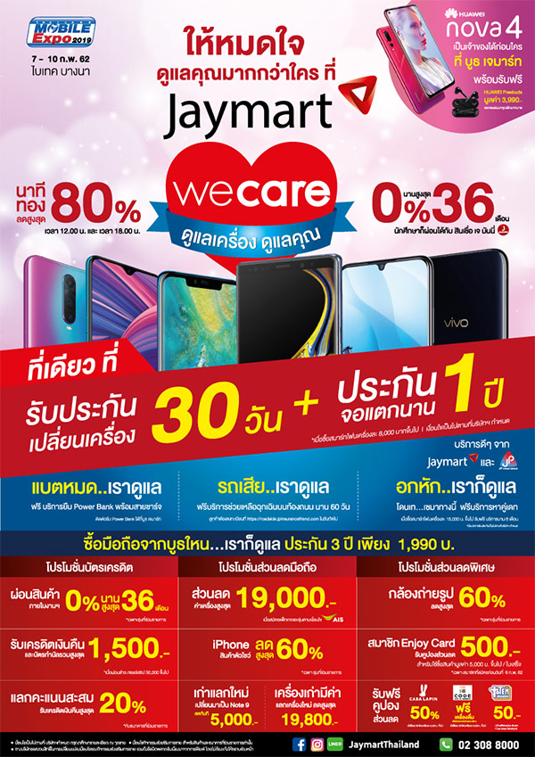 ทาง Jaymart จัดเต็มทั้งโปรโมชั่นราคาพิเศษ, การรับประกันเปลี่ยนเครื่องภายใน 30 วัน และประกันจอแตกนาน 1 ปีเต็ม โดยในรุ่น Samsung Galaxy Note 9 ความจุ 128GB ราคา 33,900 บาท พร้อมรับสิทธ์ผ่อนชำระ 0% นาน 10 เดือน โดย Samsung ผ่อนให้ฟรี 2 เดือนด้วยเครดิตเงินคืนมูลค่า 6,780 บาท และรับฟรี Wireless Charger มูลค่า 2,090 บาท (ของมีจำนวนจำกัด), Gift Set J9, Power Bank และลำโพงบลูทูธ