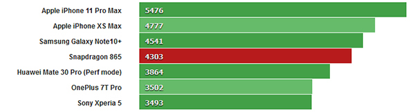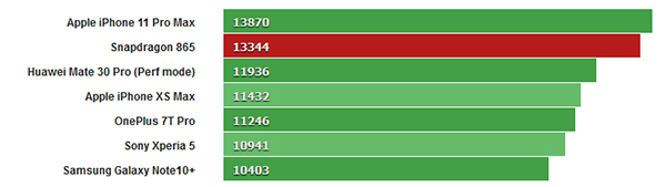 GSM Arena ได้เปรียบเทียบผลคะแนนดังกล่าวในฐานข้อมูล ทำให้เห็นว่า Snapdragon 865 มีประสิทธิภาพโดยรวมที่ใกล้เคียงกับชิปเซ็ต Apple A13 Bionic ซึ่งครองแชมป์ benchmark อยู่ในขณะนี้ โดยยังเป็นรองอยู่เล็กน้อย นับว่าทำได้ดีพอสมควรเมื่อเทียบกับที่หลายๆ คนหวังเอาไว้