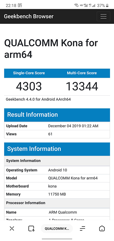ข้อมูลนี้ถูกเปิดเผยโดย Ice Universe เจ้าเก่า โดยเป็นภาพสกรีนช็อตของผลการทดสอบของ “QUALCOMM Kona for arm64” ซึ่งเป็นโค้ดเนมของ Snapdragon 865 บนแพล็ตฟอร์ม Geekbench 4 ซึ่งทำคะแนนในส่วนของ single-core 4303 คะแนน และ multi-core 13344 คะแนน
