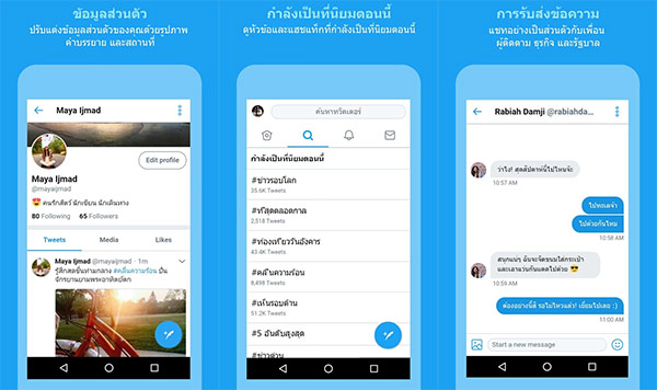 Twitter ก็ถือเป็นอีกหนึ่งแอปพลิเคชันที่ได้รับความนิยมไม่แพ้กัน สำหรับ Twitter Lite ที่เป็นเวอร์ชันเล็กนี้ ใช้พื้นที่ในการติดตั้งน้อยกว่า 3MB และลดการใช้ปริมาณอินเทอร์เน็ตขณะใช้งาน รวมถึงสามารถเปิดใช้งานโหมด Data Saver เพื่อดาวน์โหลดเฉพาะภาพ หรือวิดีโอที่ต้องการดูได้ ซึ่งยังรองรับฟีเจอร์หลักๆ เช่นเดิม ได้แก่ Timeline, Explore, Messages, Profile และ Notifications โดยรองรับการใช้งานบนสมาร์ทโฟนแอนดรอยด์เวอร์ชัน 5.0 ขึ้นไป