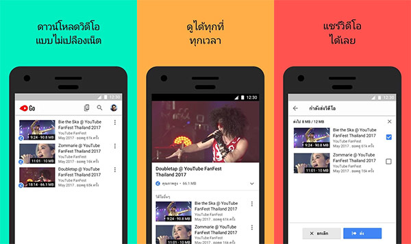 เรียกได้ว่าแทบจะไม่มีใครที่ไม่รู้จัก YouTube เว็บไซต์ศูนย์รวมคอนเทนท์ด้านวิดีโอที่ได้รับความนิยมเป็นอันดับต้นๆ ของคนทั่วโลก สำหรับสมาร์ทโฟนในระดับเริ่มต้น YouTube Go ก็เป็นทางเลือกที่น่าสนใจ ด้วยการลดขนาดแอปเหลือเพียง 9MB และรองรับการดาวน์โหลดวิดีโอเก็บไว้ที่ microSD Card เพื่อรับชมขณะออฟไลน์ได้ (ขึ้นอยู่กับเจ้าของลิขสิทธิ์) อีกทั้งยังสามารถส่งต่อคลิปวิดีโอที่ดาวน์โหลดมาไปยังเครื่องอื่นผ่านทาง Bluetooth ได้อีกด้วย