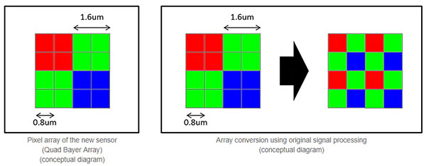 และแม้ว่าเซ็นเซอร์ Sony IMX586 จะมีพิกเซลขนาดเล็กกว่าเซ็นเซอร์ทั่วๆ ไปที่ 0.8 ไมครอน แต่ทาง Sony ก็ทดแทนด้วยฟิลเตอร์สีแบบ Quad Bayer ที่มีความสามารถในการรวมเม็ดพิกเซลที่มีสีเดียวกันแบบ 2x2 เพื่อเพิ่มความไวต่อแสง และความคมชัดให้กับภาพ โดยเฉพาะการถ่ายภาพ และวิดีโอในสภาวะที่แสงน้อย หรือเวลากลางคืน ภาพถ่ายที่ได้จะมีคุณภาพเทียบเท่ากล้องที่มีเซ็นเซอร์ขนาด 1.6 ไมครอน ความละเอียด 12 ล้านพิกเซล แต่จะเกิด noise น้อยกว่า นอกจากนี้ยังเป็นการช่วยลดขนาดเซ็นเซอร์ที่มีความละเอียดสูงให้สามารถใช้งานได้บนสมาร์ทโฟน และยังช่วยให้การดีไซน์ตัวกล้องไม่นูนออกจากตัวเครื่องอีกด้วย