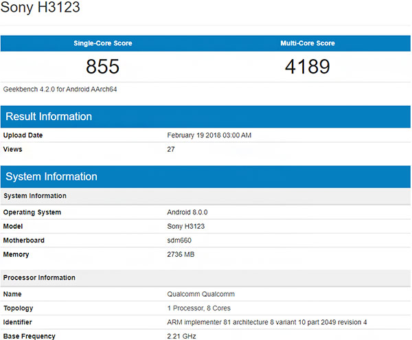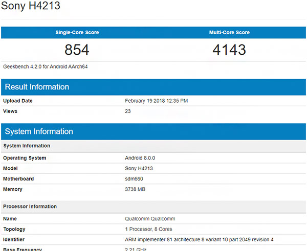 รายชื่อของ Sony H3123, H4113 และ H4213 ได้ปรากฎขึ้นในช่วงเวลาใกล้เคียงกันบนหน้าเว็บไซต์ทดสอบประสิทธิภาพสมาร์ทโฟนชื่อดังอย่าง Geekbench พร้อมเผยให้เห็นคุณสมบัติร่วมกันอย่างการใช้งานชิปเซ็ต Snapdragon 660 และระบบปฏิบัติการใหม่ล่าสุดอย่าง Android 8.0 Oreo โดยแตกต่างกันที่ขนาดของ RAM ได้แก่ 3GB (H3123, H4113) และ 4GB (H4213) ตามลำดับ