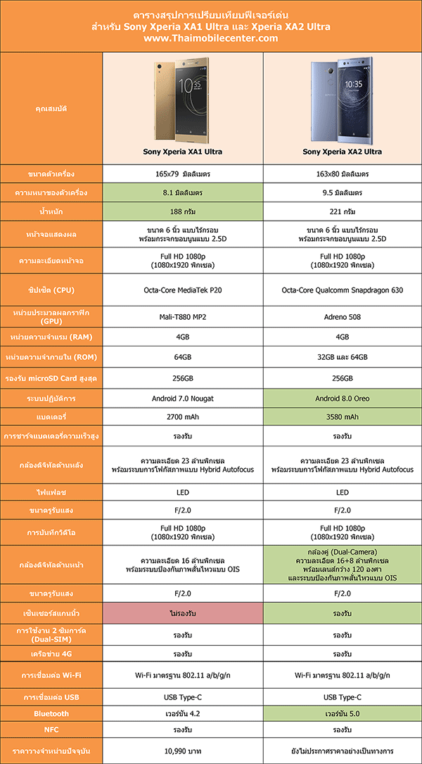 ทางทีมงาน Thaimobilecenter จึงได้นำ Sony Xperia XA2 Ultra รุ่นใหม่ล่าสุด มาทำการเปรียบเทียบคุณสมบัติ และฟีเจอร์เด่นกับรุ่นก่อนหน้าอย่าง Sony Xperia XA1 Ultra ว่ามีการอัปเกรดขึ้นจากเดิมในด้านใดบ้าง เพื่อเป็นแนวทางสำหรับผู้ที่สนใจ หากพร้อมแล้วเชิญติดตามชมการเปรียบเทียบของทั้งสองรุ่นที่ตารางด้านล่างนี้ได้เลยค่ะ