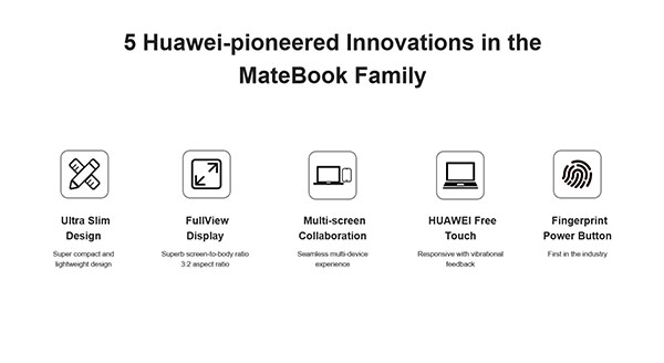 นอกจากนี้ยังเป็นแล็ปท็อปรุ่นแรกๆ ในวงการที่มาพร้อมหน้าจอแบบ FullView Display ซึ่งเป็นเทคโนโลยีแบบเดียวกับบนสมาร์ทโฟนไร้ขอบ จึงทำให้ MateBook รุ่นปี 2018 มีการดีไซน์ที่แปลกใหม่ และล้ำหน้ากว่าแบรนด์อื่น