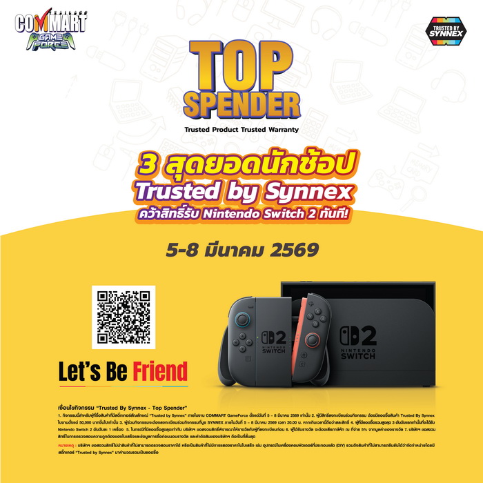 พิเศษสุด! กับกิจกรรม “Trusted By Synnex - Top Spender” ช้อปมากกว่าใคร SYNNEX มอบ Nintendo Switch 2 ให้เลย สำหรับผู้ที่มียอดซื้อสินค้าไอทีที่มีสติ๊กเกอร์ Trusted By Synnex ในงาน COMMART GAME FORCE สูงสุด 3 อันดับแรก ตลอดระยะเวลาการจัดงาน