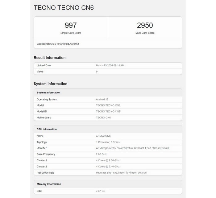 นอกจากนี้ ยังมีอุปกรณ์ Tecno ที่ใช้หมายเลขรุ่นดังกล่าวปรากฏบนฐานข้อมูล Geekbench ด้วย ซึ่งสามารถทำคะแนน single-core ได้ 997 คะแนน และ multi-core ได้ 2,950 คะแนน