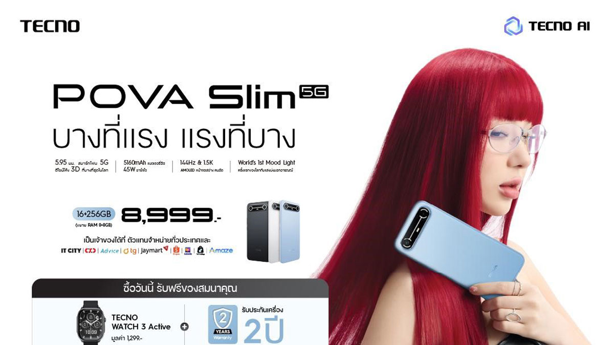 TECNO แบรนด์เทคโนโลยีนวัตกรรมที่ขับเคลื่อนด้วย AI ประกาศเปิดตัวนวัตกรรมล่าสุดในซีรีส์ POVA อย่างเป็นทางการ ได้แก่ TECNO POVA Slim 5G สมาร์ตโฟน 5G 3D Curved ที่บางที่สุดในโลก เพียง 5.95 มม.และแบตเตอรี่ความจุ 5,160 mAh รองรับชาร์จเร็ว 45W ผสานดีไซน์บางเฉียบเข้ากับพลังการใช้งานที่ยาวนานได้อย่างลงตัว ภายใต้คอนเซ็ปต์ บางที่แรง แรงที่บาง ยกระดับการผสานสไตล์แห่งอนาคตและประสิทธิภาพที่แข็งแกร่ง เพื่อตอบโจทย์ไลฟ์สไตล์ของคนรุ่นถัดไปในทุกมิติของชีวิตประจำวัน พร้อมกันนี้ TECNO ยังได้เปิดตัว “พลอยชมพู ญานนีน ภารวี ไวเกล” สะท้อนถึง พลัง ความมั่นใจ และความคิดสร้างสรรค์ ซึ่งสอดคล้องกับคอนเซ็ปต์ของ TECNO POVA Slim 5G ได้อย่างลงตัว