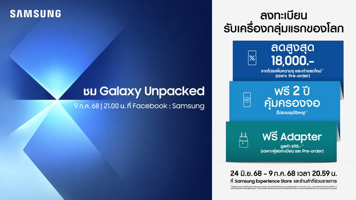 พิเศษ! ลงทะเบียนวันนี้เพื่อรับสิทธิ์ในการเป็นสัมผัส The new Galaxy ก่อนใคร พร้อมโปรฯ ฟรีคุ้มครองจอ 2 ปี ใช้งานอุ่นใจหายห่วง และสิทธิพิเศษสุดคุ้มจากซัมซุง เริ่มลงทะเบียนฟรี ที่ https://bit.ly/PR-release-250624 ตั้งแต่วันนี้ – 9 กรกฎาคม 2568 ที่ Samsung Experience Store และร้านค้าที่ร่วมรายการ