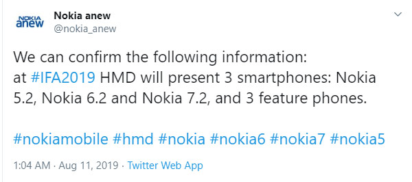 หลังจากที่มีข่าวลือเกี่ยวกับสมาร์ทโฟนระดับกลางรุ่นต่อยอดจากทาง Nokia อย่าง Nokia 5.2, Nokia 6.2 และ Nokia 7.2 มาสักพักใหญ่ ล่าสุดก็มีแหล่งข่าวในต่างประเทศที่อ้างว่าได้รับการยืนยันข้อมูลว่าทาง HMD Global จะเปิดตัวสามสมาร์ทโฟนรุ่นใหม่ดังกล่าวภายในงาน IFA 2019 ที่จะมีขึ้นช่วงต้นเดือนกันยายนนี้ พร้อมกับฟีเจอร์โฟนอีกสามรุ่นใหม่