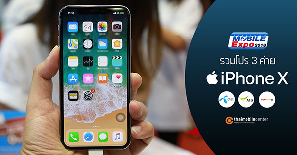 กลับมาอีกครั้งกับงาน Thailand Mobile Expo 2018 ครั้งนี้ก็ยังคงมีแบรนด์สมาร์ทโฟนตบเท้ามาร่วมจัดโปรโมชันลดแลกแจกแถมกันคึกคักเช่นเคย โดยเฉพาะโอเปอเรเตอร์ 3 ค่ายยักษ์ใหญ่ Dtac, AIS และ TrueMove H ซึ่งมาเปิดบูธรอต้อนรับทุกท่านในงานทุกปีพร้อมกับขนสมาร์ทโฟนรุ่นเด่นๆ มาจัดโปรโมชันกันด้วย หนึ่งในสมาร์ทโฟนที่ได้รับความสนใจมากที่สุดในขณะนี้คงหนีไม่พ้นเรือธงพรีเมียมอย่าง iPhone X หากใครกำลังเล็งสมาร์ทโฟนรุ่นนี้อยู่ ทีมงาน Thaimobilecenter ก็ได้รวบรวมโปรโมชันพิเศษเฉพาะในงานของ iPhone X จากทั้ง 3 ค่ายเอาไว้ให้แล้วในบทความนี้ครับ