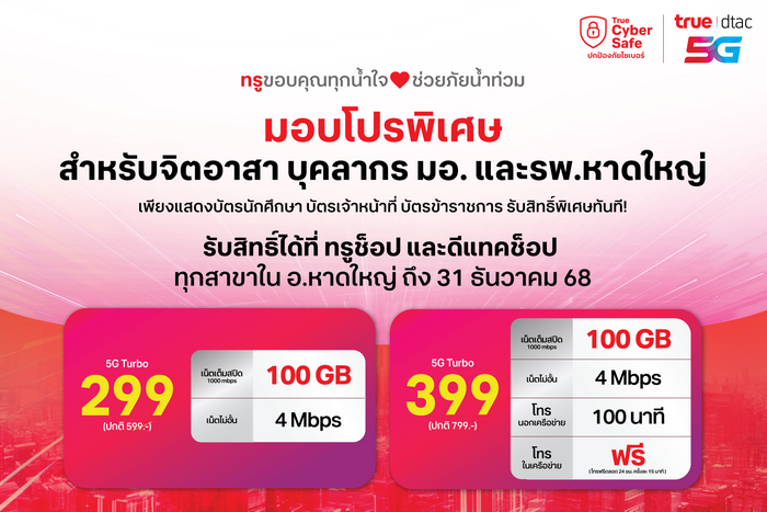 ทรูดีแทค ออกมาตรการช่วยเหลือชาวหาดใหญ่สงขลา มอบสมาร์ทโฟนเริ่มต้น 99 บาท และแพ็กเกจรายเดือนลด 50% ถึงสิ้นปี 2568