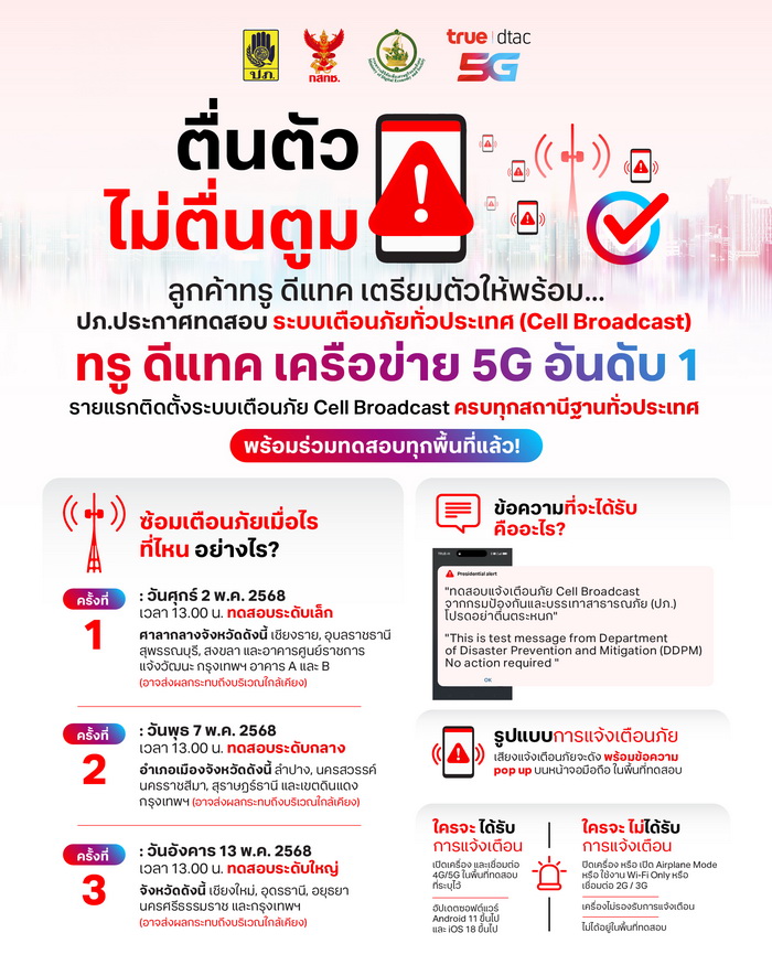 ลูกค้าทรู ดีแทค เตรียมตัวให้พร้อม... ปภ. ประกาศทดสอบระบบเตือนภัยทั่วประเทศ (Cell Broadcast) ทรู ดีแทค เครือข่าย 5G อันดับ 1 รายแรกติดตั้งระบบเตือนภัย Cell Broadcast ครบทุกสถานีฐานทั่วประเทศ พร้อมร่วมทดสอบทุกพื้นที่แล้ว