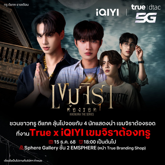 มาอัพความสุข ยิ้มกว้างสู่การรับชมซีรีส์ระดับโลกด้วยคุณภาพสูงสุด บนเครือข่ายทรู 5G ที่คลื่นครบทุกย่านมากที่สุด 8 ย่านความถี่สูงสุดในไทย ดีสุด และพรีเมียมที่สุด พร้อมลุ้นเข้าร่วมกิจกรรมสุดเอ็กซ์คลูซีฟ “True x iQIYI เขมจิราต้องทรู” เพียง 3 ขั้นตอนง่ายๆ 1. รีบซื้อ: สมัครแพ็กเกจ True dtac5G iQIYI VIP Premium รายปีตั้งแต่วันนี้ถึง 30 พ.ย.นี้ 2. คอมเมนต์ให้ปัง: ไปที่โพสต์กิจกรรมของ TRUE 5G บน X แล้วตอบคำถาม “ดูเขมจิราต้องรอดแบบ VIP Premium กับทรู มันฟินยังไง” 3.ยืนยันสิทธิ์: กรอกรายละเอียดผ่านแบบฟอร์มออนไลน์ โดยทีมงานจะคัดเลือก 130 คอมเมนต์ที่โดนใจเพื่อรับสิทธิ์ โดยจะประกาศผลผู้โชคดีให้ทราบพร้อมกันทางช่องทางโซเชียลมีเดียของทรู 5G พิเศษยิ่งขึ้นสำหรับลูกค้า TrueBlack และ dtac PLATINUM BLUE MEMBER เข้าร่วมงานได้ทันที ไม่ต้องลุ้น เพียงสมัครแพ็กเกจแล้วกดรับสิทธิ์ผ่าน SMS (จำกัด 20 สิทธิ์ท่านแรกเท่านั้น - สำหรับ TrueBlack 10 สิทธิ์ และ dtac Platinum PLATINUM BLUE MEMBER 10 สิทธิ์)