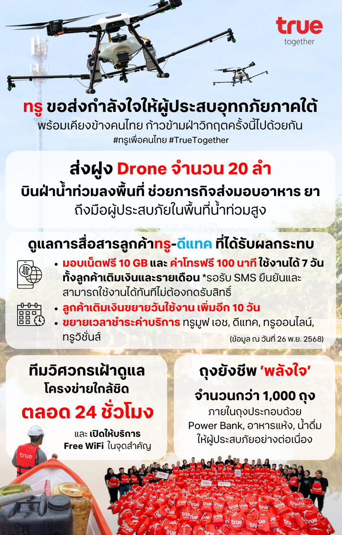 ทรู ระดมสรรพกำลัง เร่งช่วยผู้ประสบอุทกภัยพี่น้องชาวใต้ ส่งฝูงโดรน 20 ลำเสริมภารกิจ มอบถุงยังชีพ อาหาร–น้ำดื่ม–พาวเวอร์แบงค์ ดูแลการสื่อสารลูกค้าทรู–ดีแทค พร้อมเคียงข้างคนไทย ก้าวข้ามฝ่าวิกฤตครั้งนี้ไปด้วยกัน