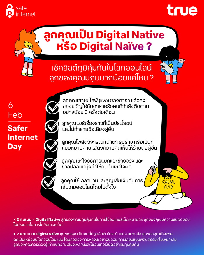 ในยุคที่นิวเจน เติบโตมาพร้อมกับเทคโนโลยีและความคุ้นเคยกับการใช้งานอุปกรณ์ดิจิทัล ปัจจุบันพบว่าเด็กไทยใช้เวลากว่า 12 ชั่วโมงต่อวันท่องโลกอินเทอร์เน็ต โดย 83% ของเด็กไทยเข้าถึงอินเทอร์เน็ตได้ง่ายและรวดเร็วยิ่งขึ้น ทำให้มีโอกาสสูงมากที่เด็กเหล่านี้จะเผชิญกับความเสี่ยงบนโลกออนไลน์หลากหลายรูปแบบ อันนำมาสู่การตั้งคำถามผู้ปกครองที่ต้องเลี้ยงลูกยุคดิจิทัลว่า “ในฐานะพ่อและแม่ คุณรู้จักลูกคุณดีแค่ไหน เมื่ออยู่บนโลกออนไลน์” และเนื่องใน “วันแห่งการใช้อินเทอร์เน็ตอย่างปลอดภัยสากล” (Safer Internet Day) 6 กุมภาพันธ์ 2567 ทรู คอร์ปอเรชั่น เทคคอมปานีไทย ที่มุ่งมั่นขับเคลื่อนสังคมแห่งการใช้อินเทอร์เน็ตอย่างสร้างสรรค์และบริการโทรคมนาคมอย่างปลอดภัย เปิดเช็คลิสต์ ให้ผู้ปกครองได้ลองทดสอบว่าลูกของคุณมีภูมิคุ้มกันบนโลกออนไลน์มากน้อยแค่ไหน