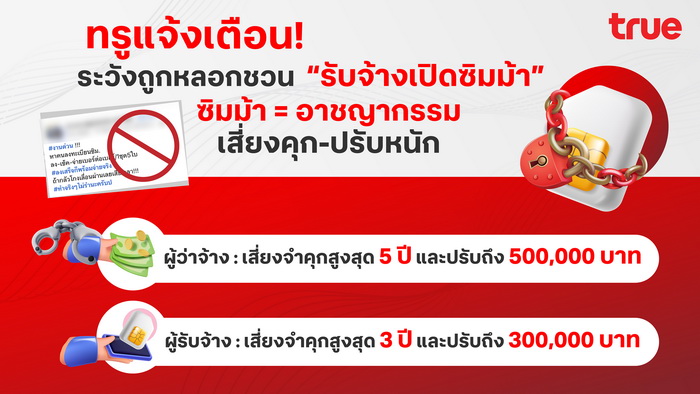 ทรู ขอเน้นย้ำ อย่าหลงเชื่อคำเชิญชวนให้รับจ้างเปิดซิมทุกกรณี เพราะนอกจากจะเสียข้อมูลส่วนบุคคลไปแล้ว ยังมีความผิดทางกฎหมายและอาจต้องรับโทษทั้งจำคุกและเสียค่าปรับจำนวนมาก