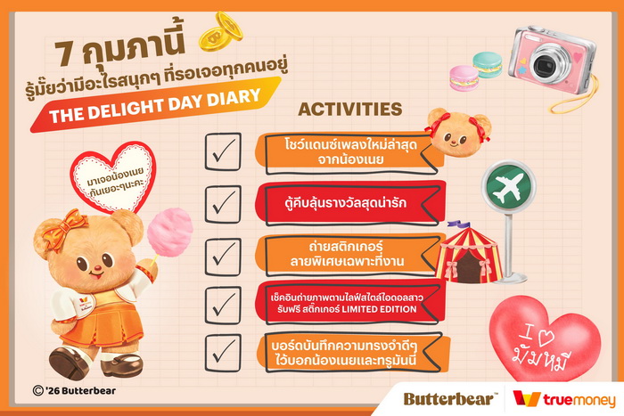 ทรูมันนี่ ผู้นำด้านบริการอิเล็กทรอนิกส์เพย์เมนต์และผู้ให้บริการทางการเงินดิจิทัลชั้นนำในภูมิภาคเอเชียตะวันออกเฉียงใต้ ชวนเหล่ามัมหมีร่วมสัมผัสประสบการณ์สุดเอกซ์คลูซิฟในงาน “The Delight Day Diary” อีเวนต์พิเศษที่มาพร้อมความน่ารักสดใสของ “น้องเนย” (Butterbear) ไอดอลสาวสุดฮอตขวัญใจมหาชน ยกทัพกิจกรรมมากมายมาไว้ในงานเดียว ให้แฟน ๆ ได้ร่วมสร้างโมเมนต์สุดประทับใจแบบใกล้ชิด โดยงานจะจัดขึ้นใน วันเสาร์ที่ 7 กุมภาพันธ์ 2569 ณ INFINICITY HALL ชั้น 5 ศูนย์การค้าสยามพารากอน และเปิดให้เข้าร่วมงานฟรี ไม่มีค่าใช้จ่าย