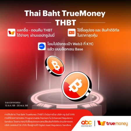THBT ถือเป็นนวัตกรรมสำคัญที่พัฒนาขึ้นบนเทคโนโลยีบล็อกเชนสาธารณะ ซึ่งมีเป้าหมายเพื่อรองรับการชำระเงินดิจิทัลที่ปลอดภัย โปร่งใส และสามารถตรวจสอบได้เต็มรูปแบบ พร้อมเชื่อมต่อกับระบบนิเวศของ TrueMoney ได้อย่างราบรื่น ผู้ใช้งานสามารถเข้าถึงและบริหารจัดการ THBT ได้อย่างง่ายดายผ่านแอปพลิเคชันทรูมันนี่ เพื่อนำไปใช้ซื้อคูปองส่วนลด และแลกเปลี่ยนสินค้าดิจิทัลผ่านบริการของ Ascend Bit (แอสเซนด์ บิท) ภายใต้ Digital Asset Regulatory Sandbox