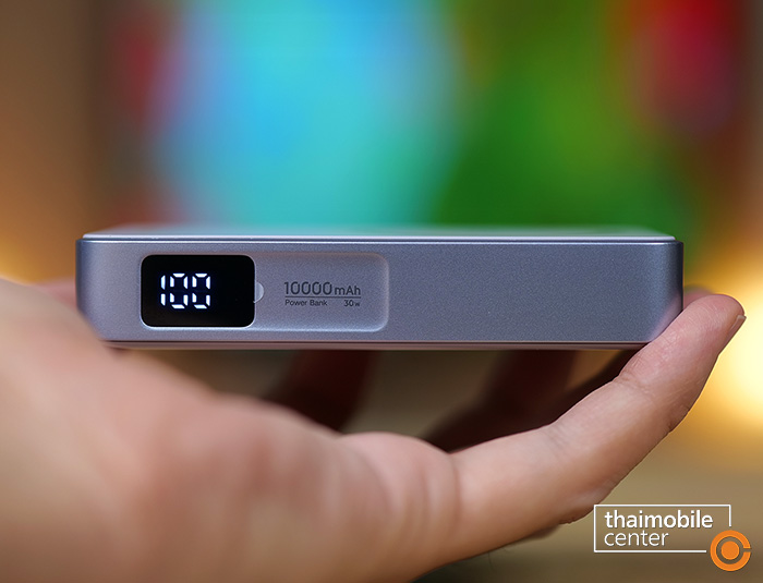 จุดเด่นอีกอย่างก็คือเราสามารถตรวจสอบเปอร์เซ็นต์ของแบตเตอรี่ที่เหลืออยู่ได้ทันทีผ่านทางหน้าจอ LED ที่ด้านข้างของพาวเวอร์แบงก์ โดยความจุของแบตเตอรี่ที่ระบุไว้ 10000mAh นั้นจะเป็นแบบ Total Cell Capacity หรือเป็นความจุของเซลล์แบตเตอรี่รวมทั้งหมด แต่ในการใช้งานจริงเราต้องดูที่ค่า Rated Capacity เป็นหลัก ซึ่งเป็นความจุของแบตเตอรี่ที่สามารถชาร์จไปยังอุปกรณ์อื่นได้จริง เนื่องจากพลังงานส่วนหนึ่งต้องสูญเสียไปกับกระบวนการแปลงแรงดันไฟฟ้า ซึ่งข้างกล่องระบุเอาไว้อย่างชัดเจนที่ 5600mAh (5V/3A) ว่ากันง่าย ๆ ก็คือ หากเป็นสมาร์ตโฟนที่มีความจุแบตเตอรี่ที่ 5000mAh ก็จะสามารถชาร์จได้ประมาณ 1.12 รอบ ไม่ใช่ 2 รอบแต่อย่างใด