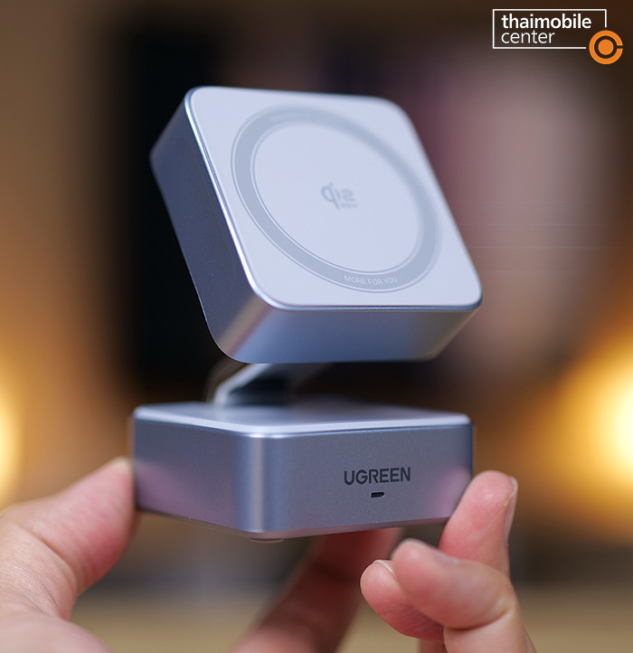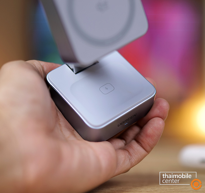 ผลิตภัณฑ์ตัวต่อมาก็คือ UGREEN MagFlow 2-in-1 Magnetic Wireless Charger 25W แท่นชาร์จแม่เหล็กไร้สายแบบตั้งโต๊ะที่มีความคล่องตัวสูง ด้วยน้ำหนักที่เบาเพียง 224 กรัม เรียกว่าเบากว่ารุ่นที่เป็นพาวเวอร์แบงก์เสียอีก รวมทั้งสามารถพับเก็บได้ กางออกได้ จึงเหมาะสำหรับการพกพาไปใช้งานนอกสถานที่ด้วย