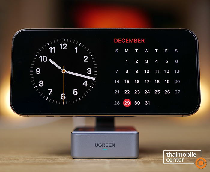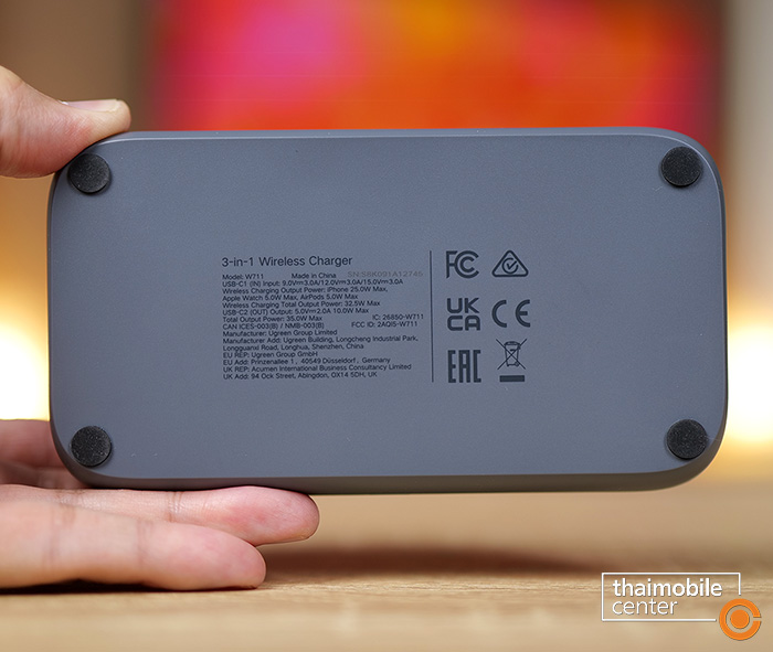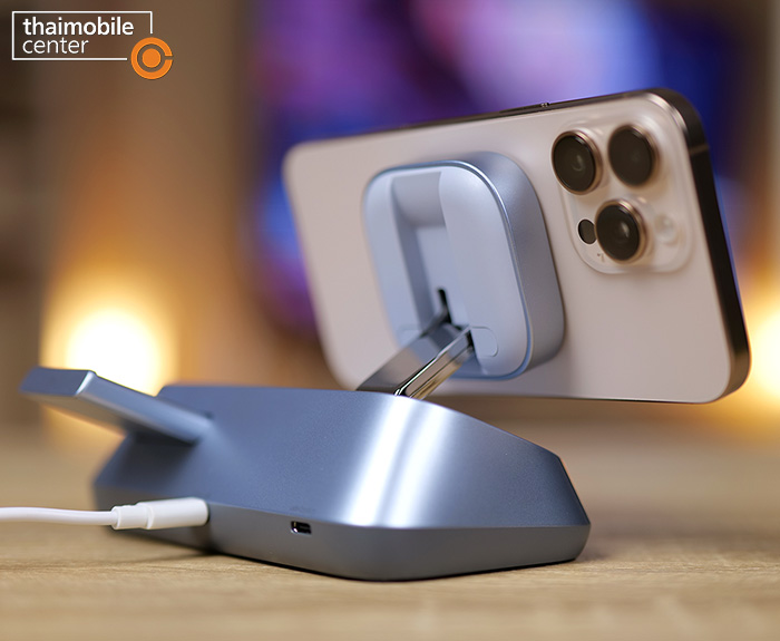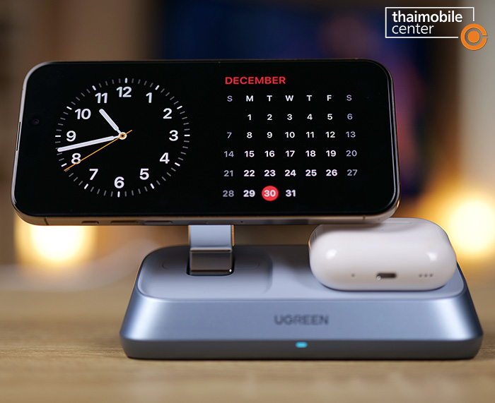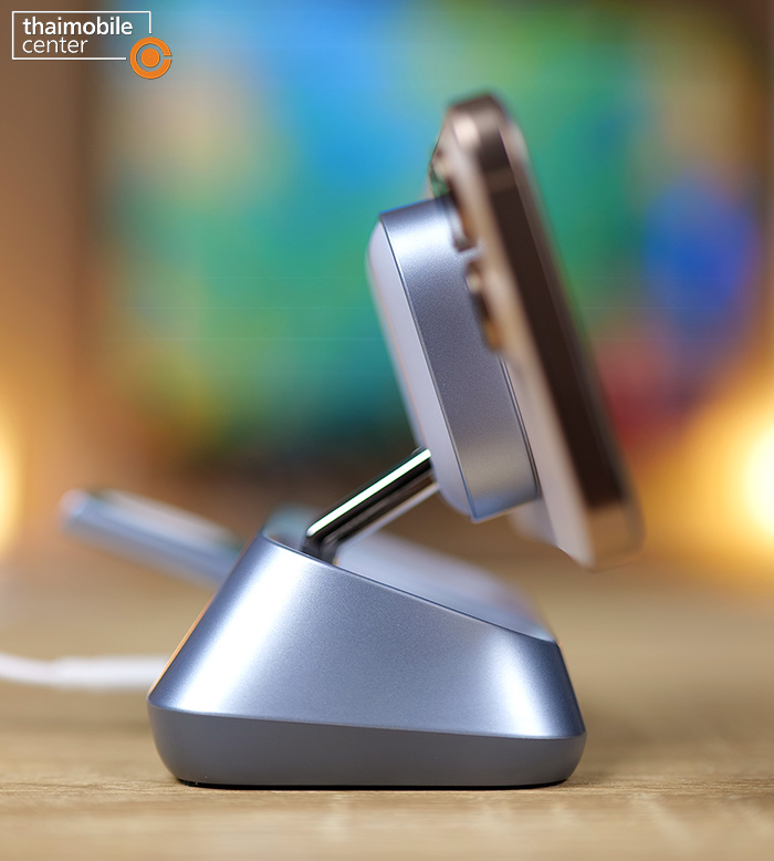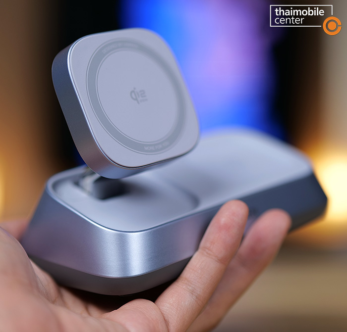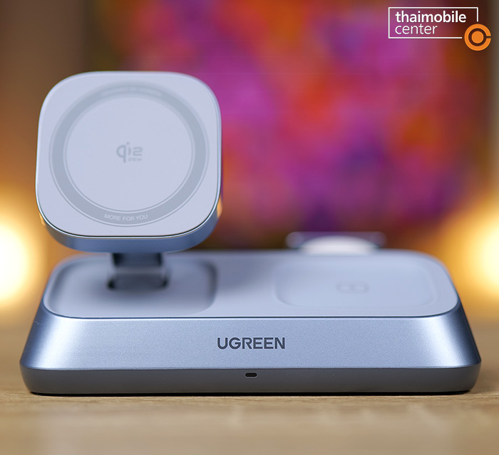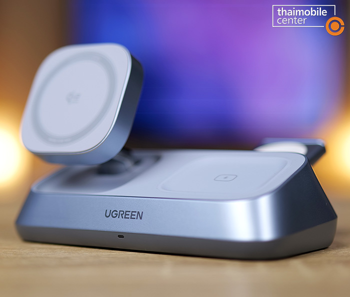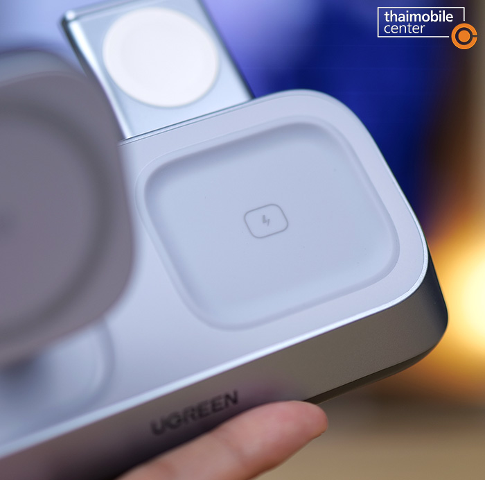 แต่สิ่งที่แตกต่างชัดเจนก็คือตัวนี้จะมีแท่นชาร์จไร้สายถึง 3 แท่นในเครื่องเดียว นั่นคือแท่นชาร์จหลักที่เป็นแบบแม่เหล็กไร้สายกำลังไฟ 25W สำหรับสมาร์ตโฟน, แท่นชาร์จไร้สายกำลังไฟ 5W สำหรับหูฟัง AirPods ซึ่งอยู่ถัดมาทางด้านขวา และแท่นชาร์จไร้สายกำลังไฟ 5W สำหรับนาฬิกา Apple Watch ซึ่งสามารถสไลด์ออกมาได้จากด้านหลัง นั่นคือแต่เดิมบนโต๊ะจะต้องมีที่ชาร์จวางไว้แยกกัน 3 อย่าง แต่เมื่อถูกรวมเข้าด้วยกันแบบ 3-in-1 แบบนี้ ก็จะช่วยให้เราประหยัดพื้นที่บนโต๊ะได้มากขึ้น และดูดีสะอาดตามากขึ้น